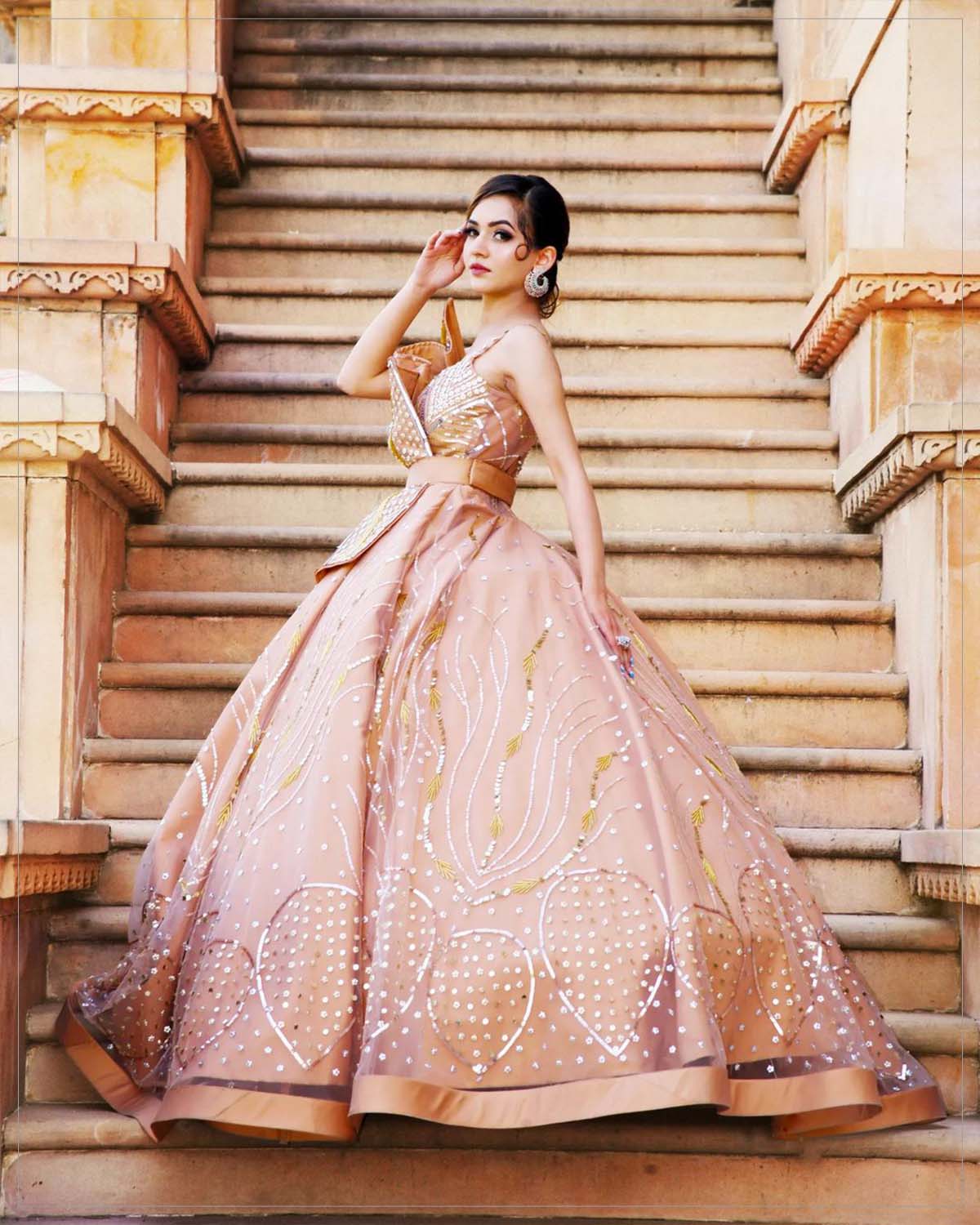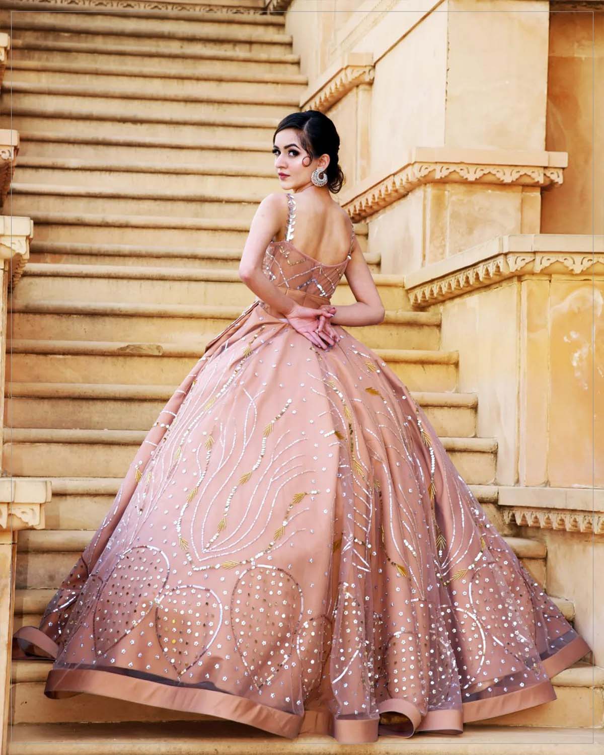 Fashion transcends the norms of ordinary with this glimmering Victorian-style gown cut out of tulle and silk. Set on a nude peach base this extravaganza of grace and elegance has fine workmanship of cutdana, sequins, flowers, and pearls adding to its versatile character. A detachable waist flap belt gives it a panache as you glide down like a dream to the party making all the heads turn in awe!