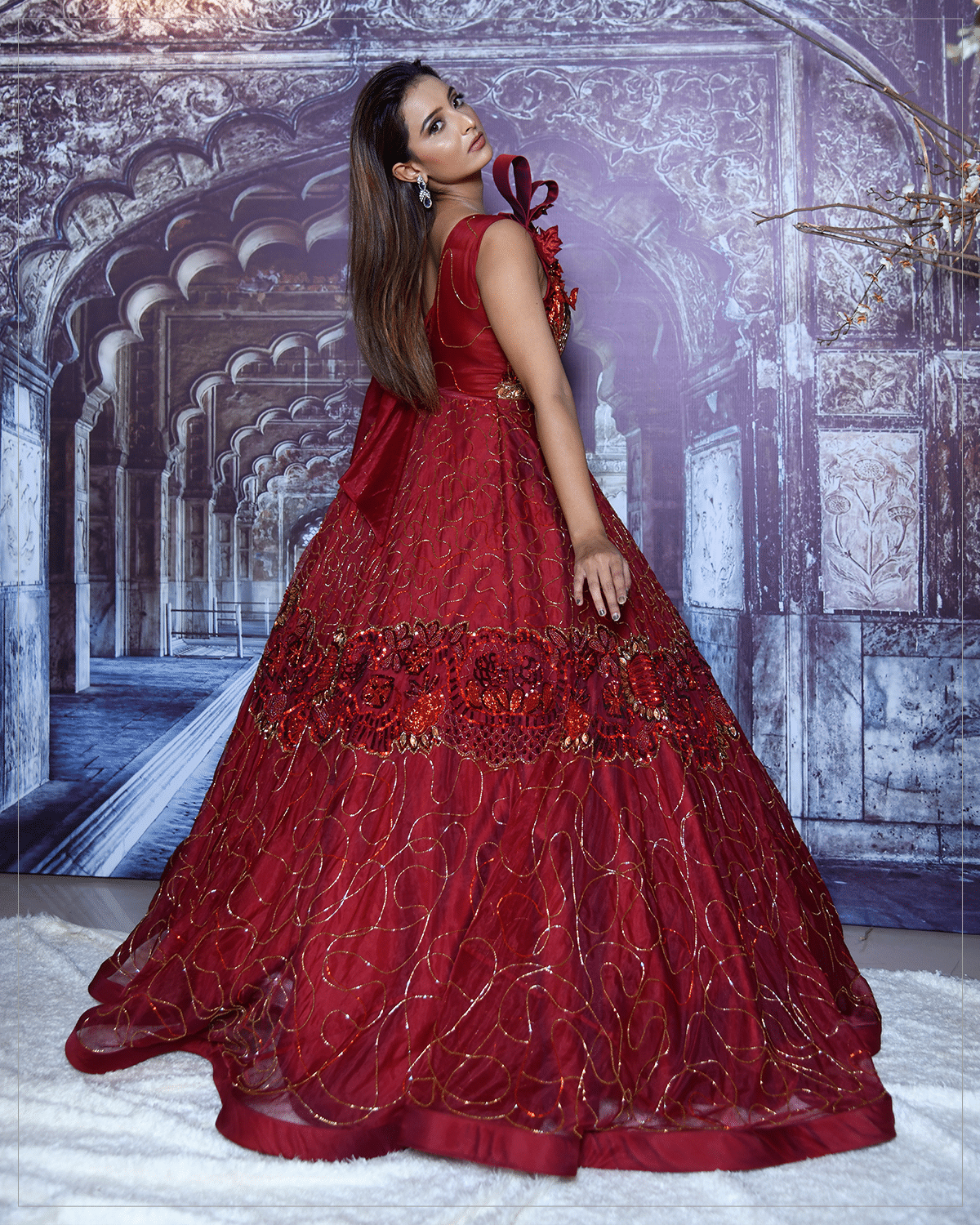 A stylish story unfolds in this classy maroon-colored gown in organza and silk. Embellished luxuriously with cutdana, sequins and France cut, this absolutely ethereal and incandescent ensemble is an exquisite addition to your formal wardrobe. Adding glamour, this gorgeous outfit features a structured heavily embellished floral motif on the shoulder.
