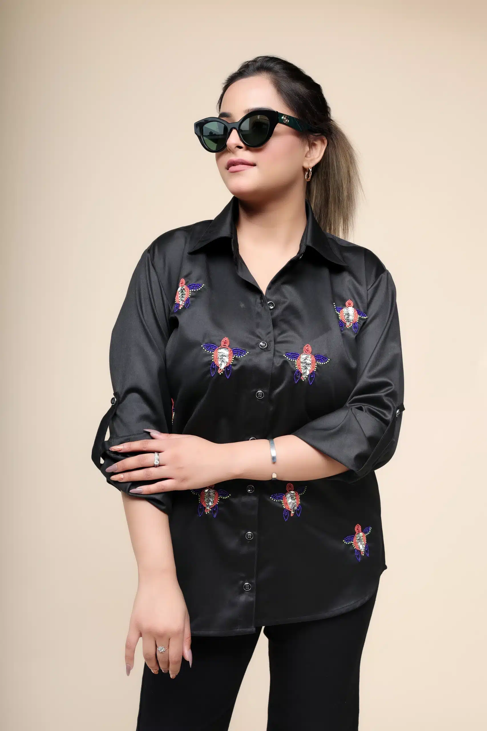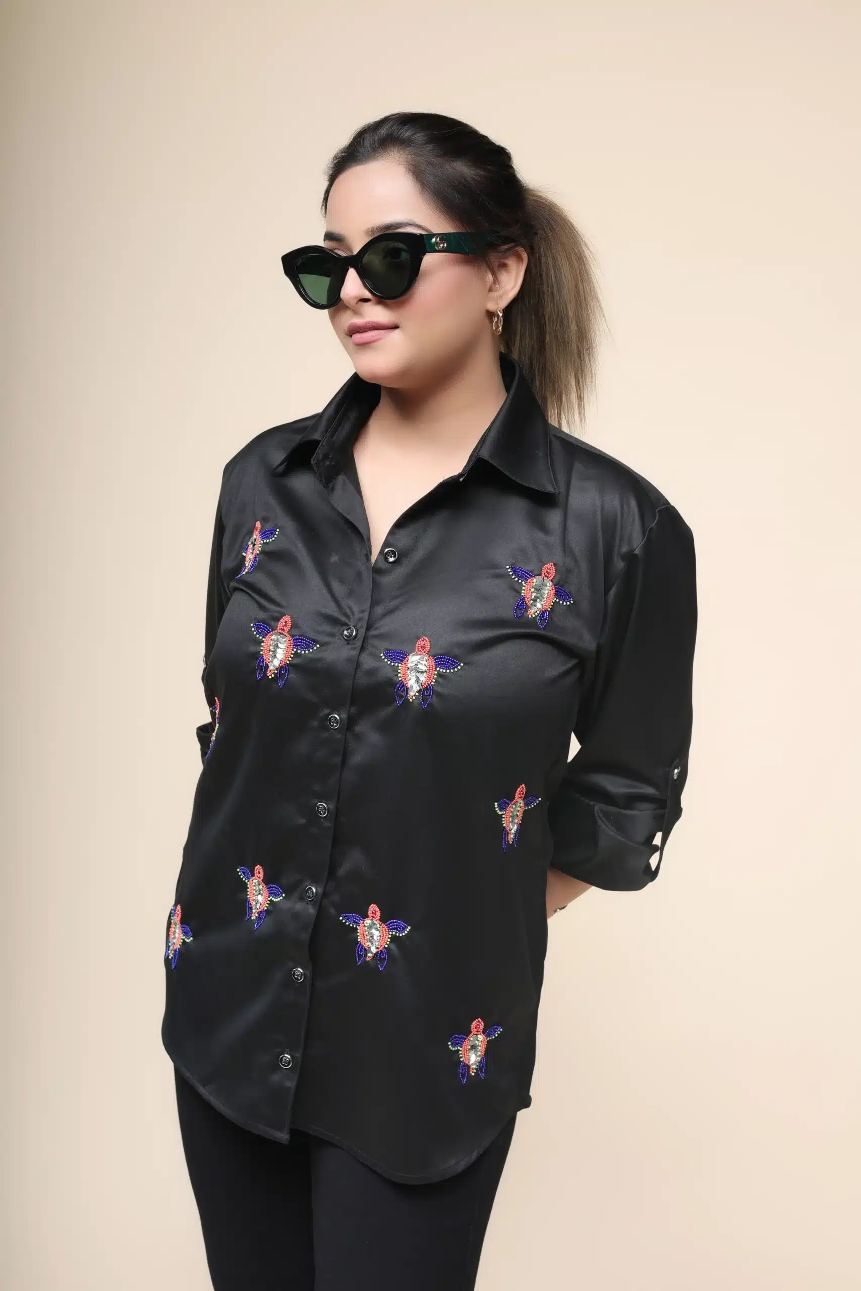 Black is the epitome of timeless elegance, and it never fails to impress. Stay effortlessly cool in this Egyptian cotton shirt, designed to be soft and breezy. The super stylish piece features adorable turtle motifs delicately embroidered on the front. But what truly sets it apart is the striking contrast of coral and royal blue colors in the motifs, giving this shirt a truly unique and captivating appeal. Embrace the charm of this one-of-a-kind garment and make a statement wherever you go.