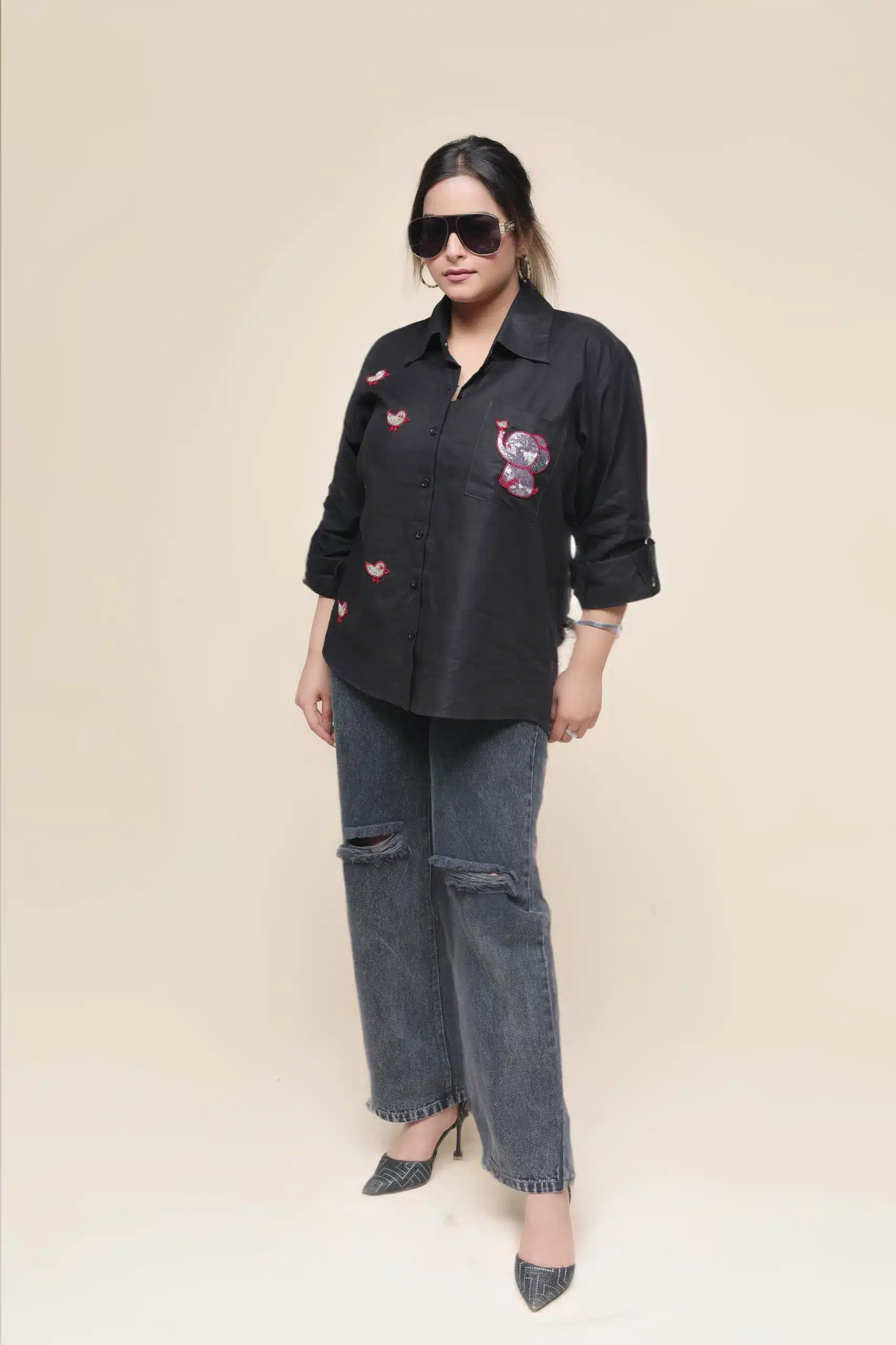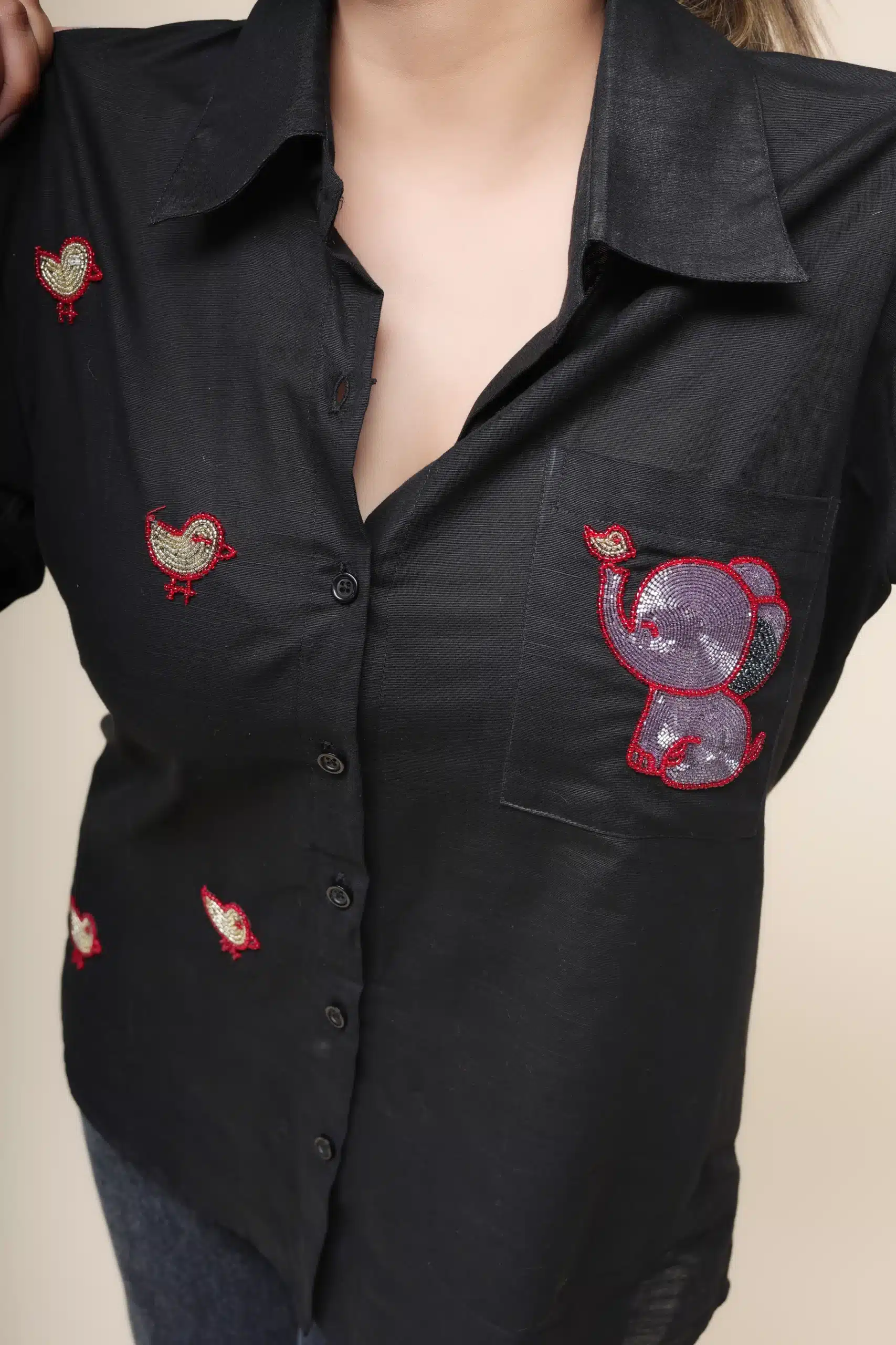 Prepare to be overwhelmed by cuteness with these adorable baby elephant and birdie embroidery patterns on this black shirt. They are simply irresistible! Made with the finest linen, this shirt offers a comfortable fit that you’ll love. Embrace the lovable charm of these little creatures and rock the look.