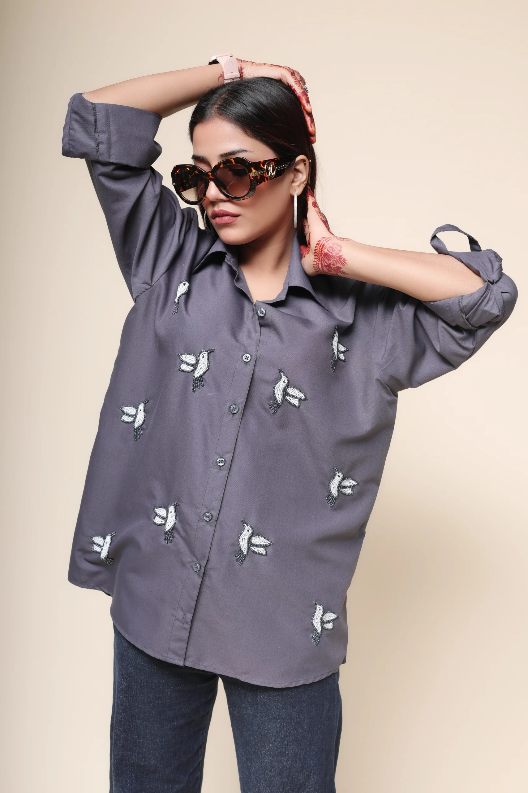 Embrace your inner strength and confidence with this cool shirt, crafted from luxurious Egyptian cotton for a soft and breezy feel. Featuring scattered cute bird motifs beautifully embroidered on the front, this shirt adds a touch of playfulness and charm to your outfit.