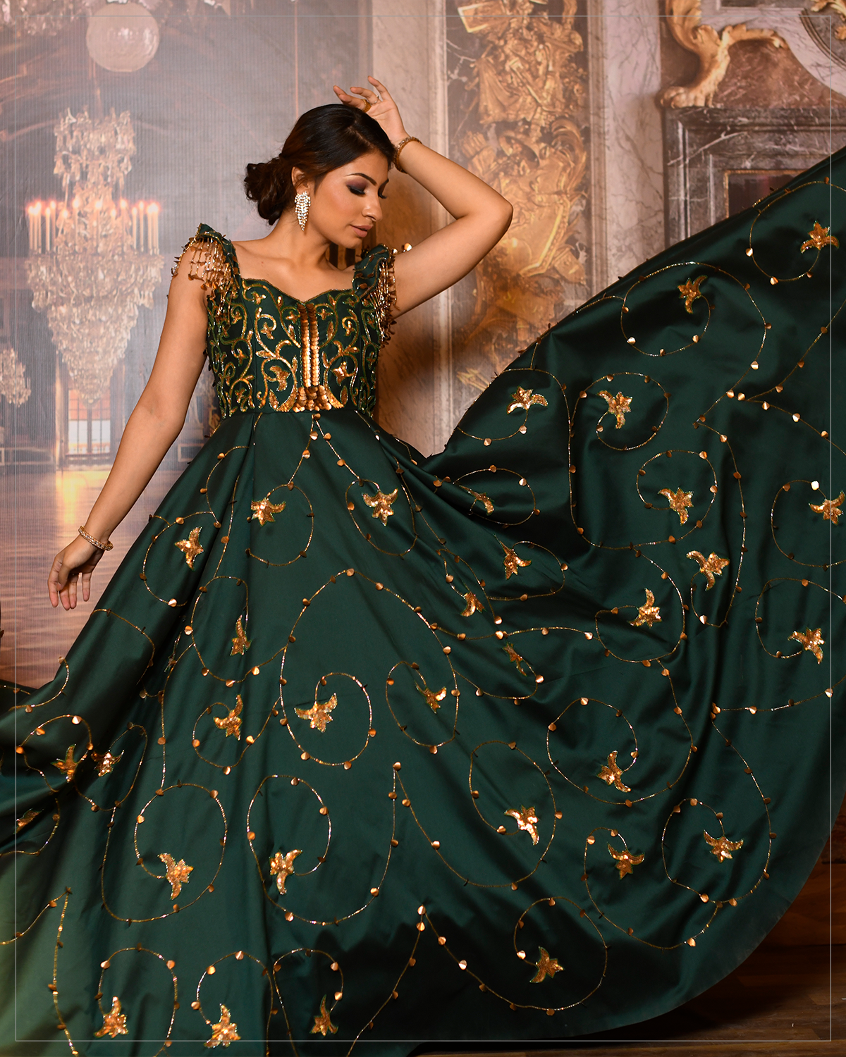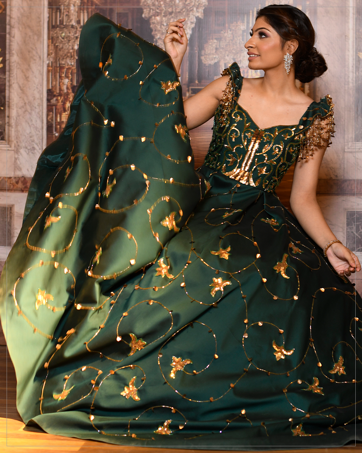 Get the heads turning with this phenomenal gown crafted in olive green silk as a base, where classic elegance melds seamlessly with modern glamour. This fine Cutdana, Sequins, and Gotta work are one of the finest examples of workmanship of our veteran karigars and their passion. The stunning piece is further accentuated with the tassels on shoulder sleeves adding to it a captivating composition!