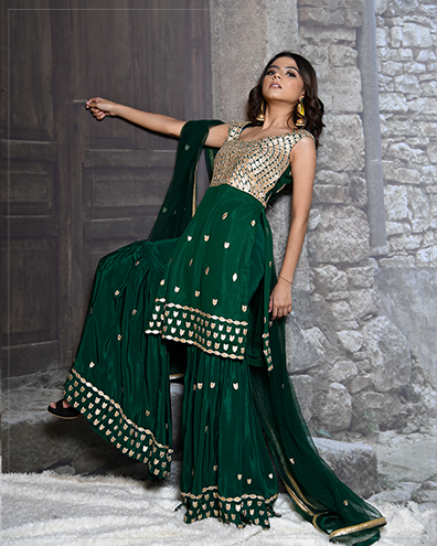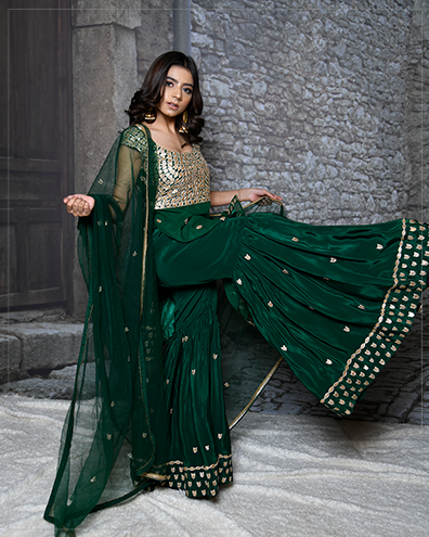 Redefine the word ‘Classy’ with this Powder Blue Gown in the finest tulle and pure Satin. Intricately embroidered with silver and golden cut dana work & embellished with different-sized sequins the gown adorns unique geometrical patterns that give it a unique look. The ruffled sleeves take the style quotient many notches higher giving a look that is both contemporary and classy.
