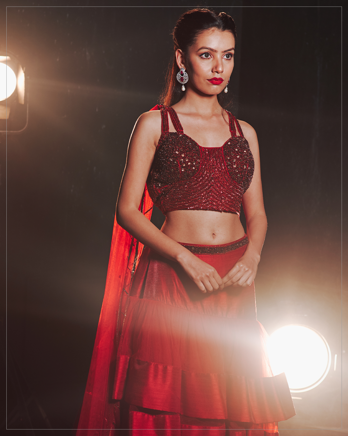 The fine panorama of feminine enigma is crafted in this extravaganza of style and design cut out of pure silk and tulle. The strikingly beautiful skirt set is crafted on a red base with shoulder trails on both shoulders adding a touch of playfulness. The fine workmanship comes alive in cutdana, sequins and France cut defining the passion only a woman is capable of!