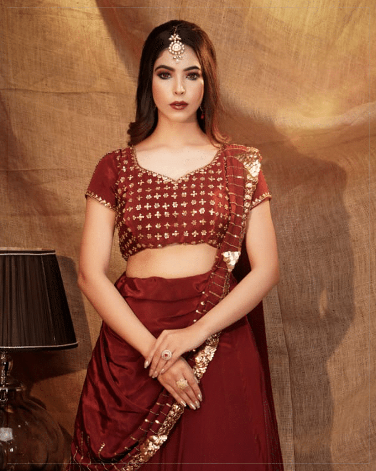 The fine work of sequins, pearl and Gota gives a scintillating look to this versatile ensemble which is styled in sheer perfection