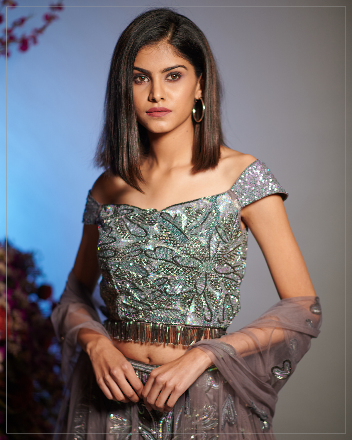 The fairy tales always begin with some mystery and fantasy which we bring alive in this ravishing Croptop and Skirt crafted to flatter the most elegant feminine silhouette! The mouse-colored rhapsody in tulle and crepe has its notes embellished in sequins, cutdana, and exquisite Patti work, putting together all the elements for a scintillating performance!