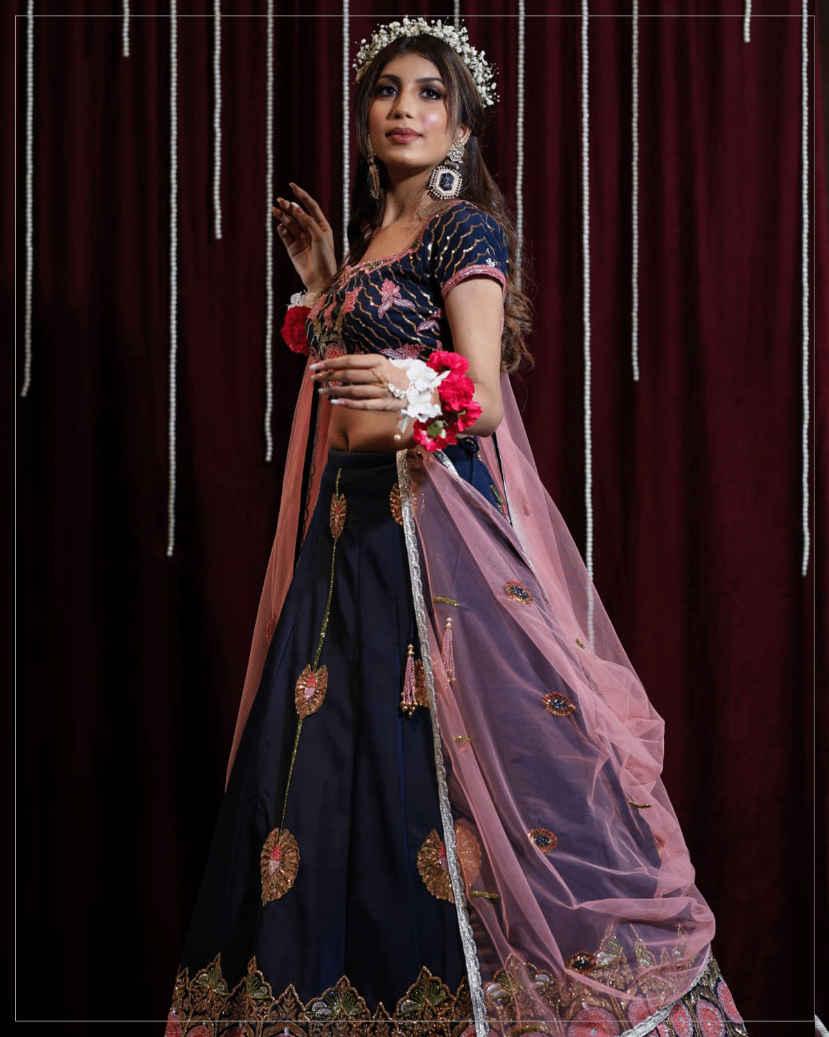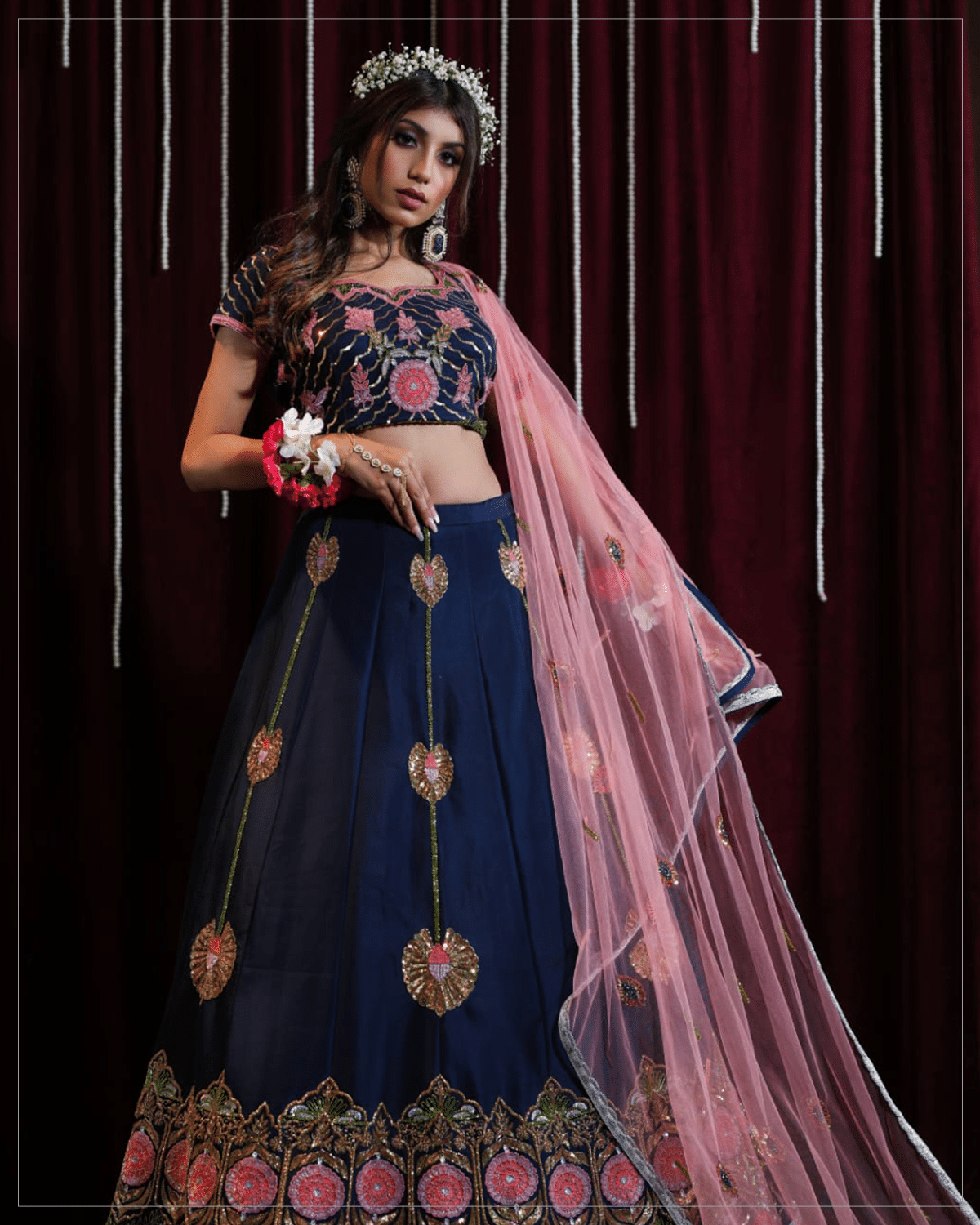 A strikingly beautiful Lehanga-choli cut out of silk and tulle in a combination of navy blue and pink colors compliments and accentuates each other to give you a unique fashion statement.