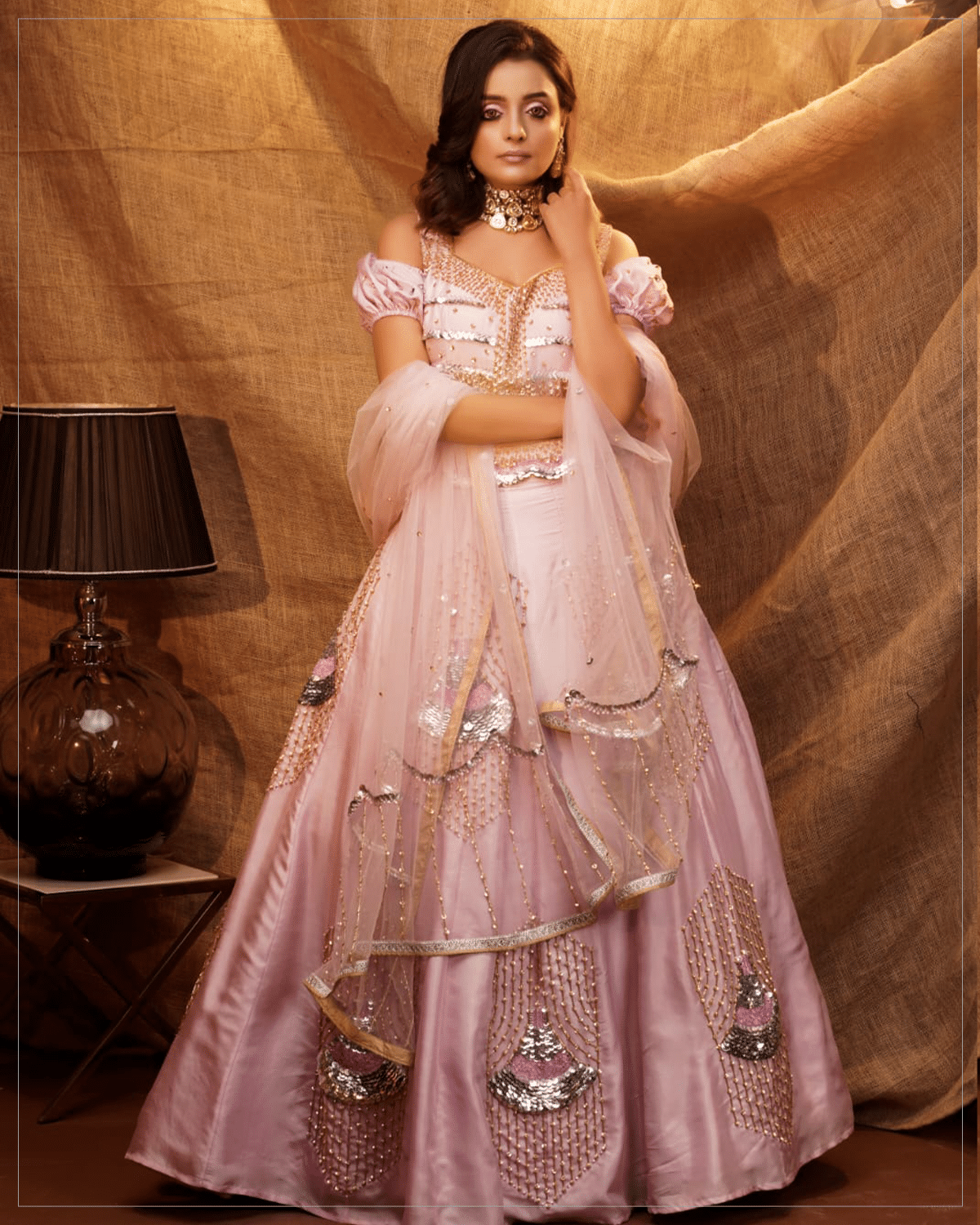 The fine art of dressing up to the occasion comes alive in this gorgeous off-shoulder lehenga crafted stylishly out of pure silk and tulle.
