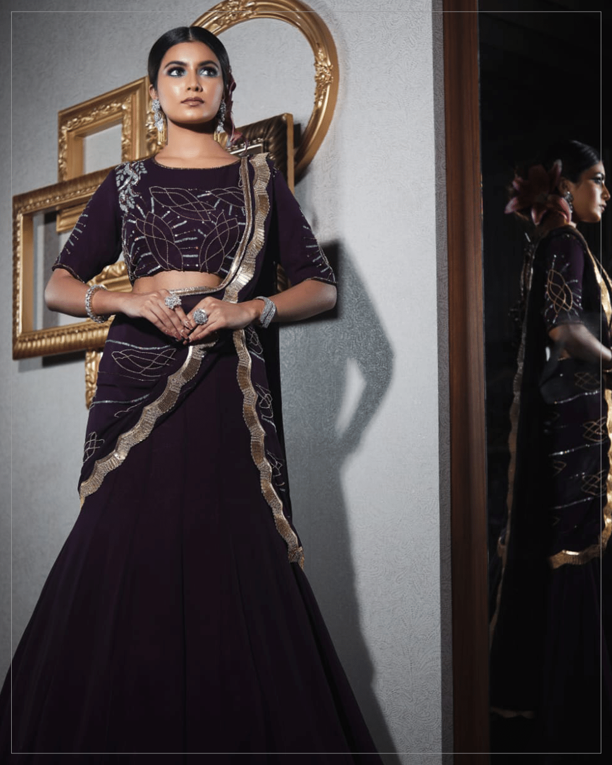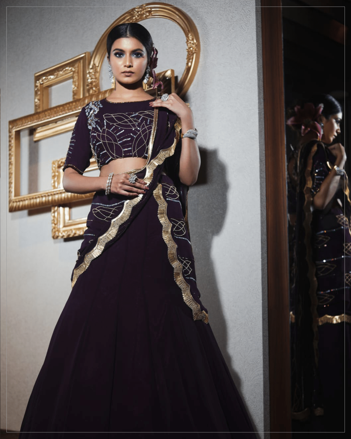 A rhapsody in its most sublime form, this gorgeous lehenga choli is styled out of dark purple georgette.