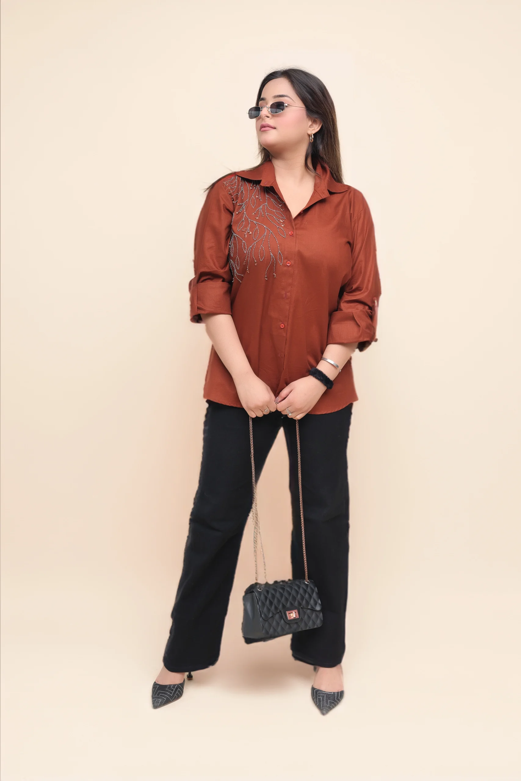 Discover the perfect blend of grace and style with our exquisite rust-colored formal shirt. Crafted from premium linen fabric and adorned with intricate moti and patti embroidery, this shirt is a true masterpiece.