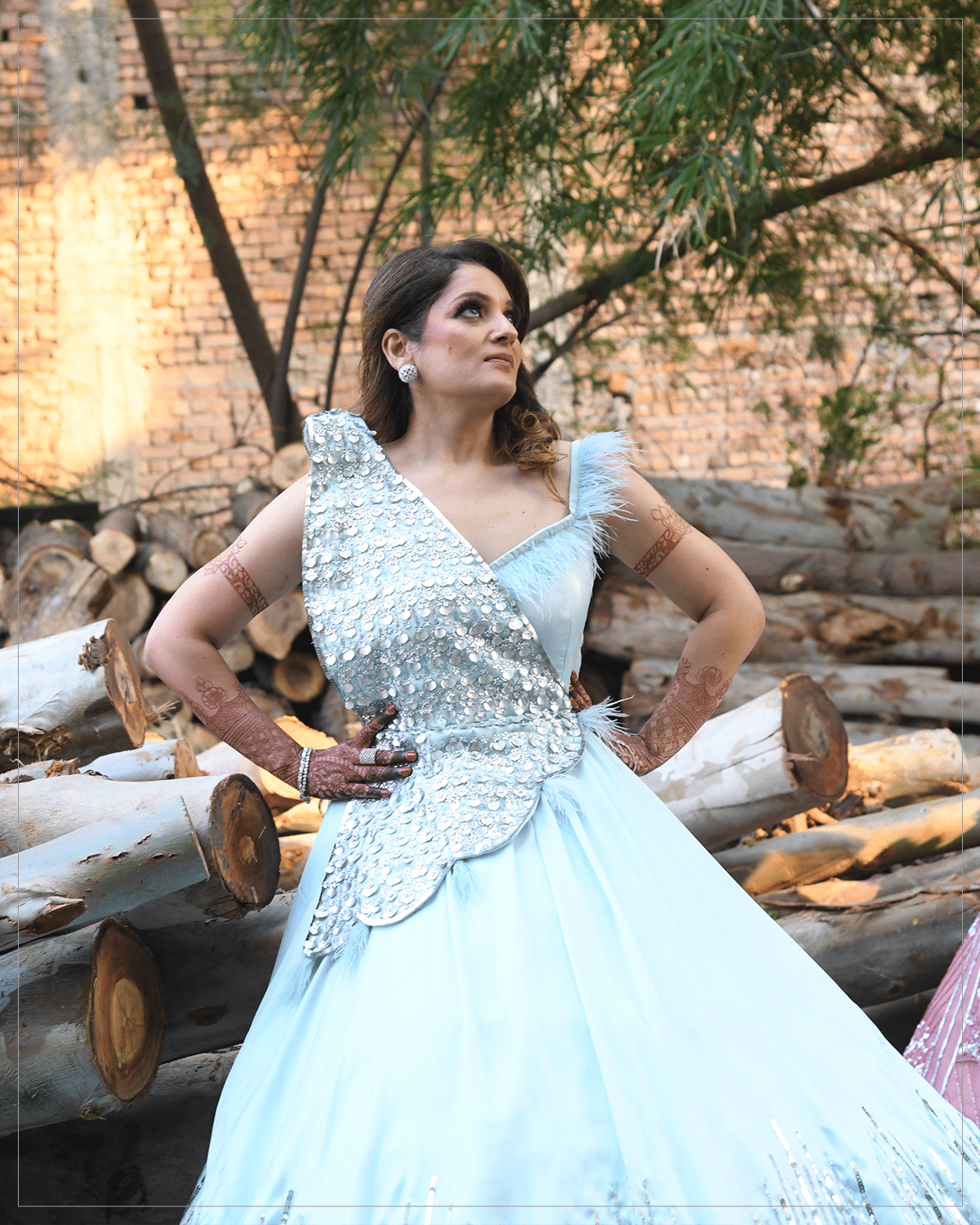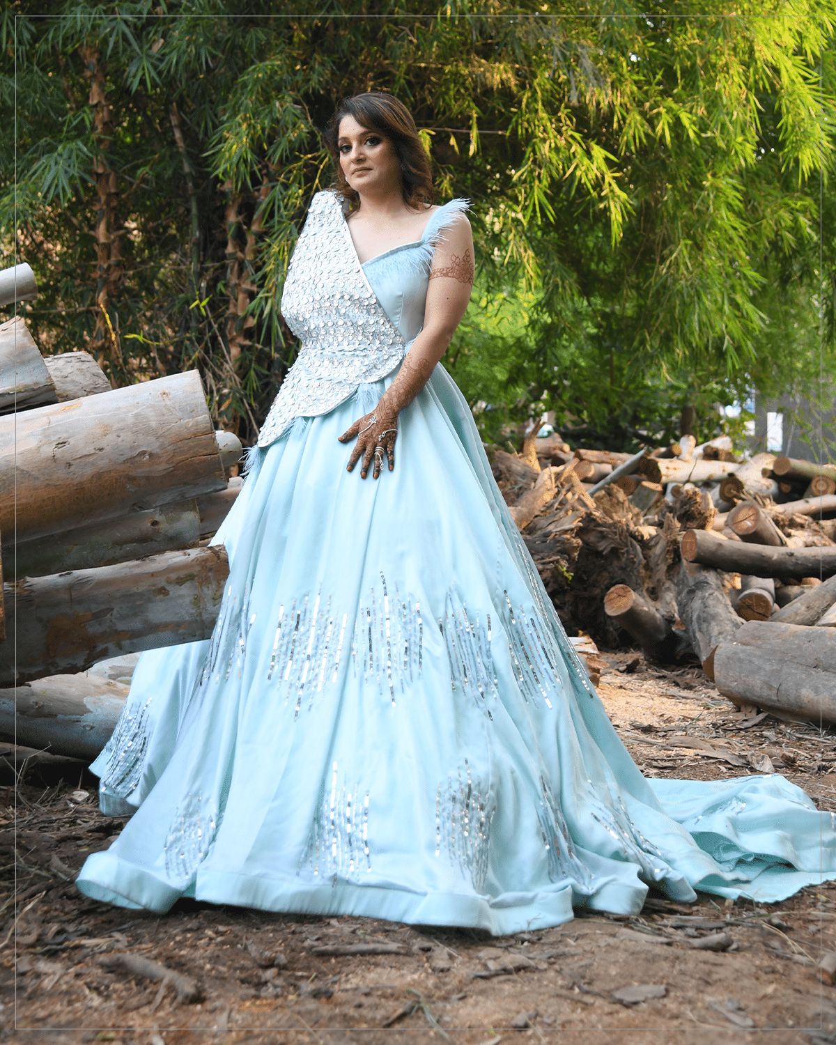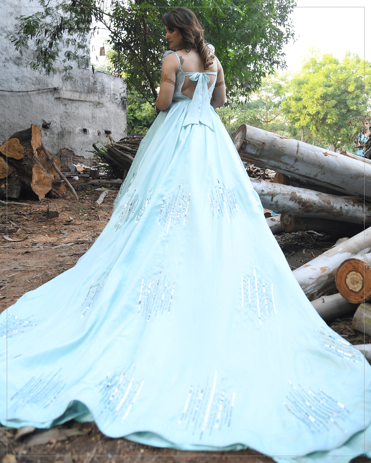 This gown is set on the horizons of exemplary design, cut out of delicate satin georgette, and put on a sky blue base. This dignified ensemble encompasses in its graceful folds the hard work of our seasoned kaarigars who have adorned it with intricate work of sequins, flowers, and feathers. The graceful back trail and waist flaps put you right into the place you belong- A Fairy Tale!