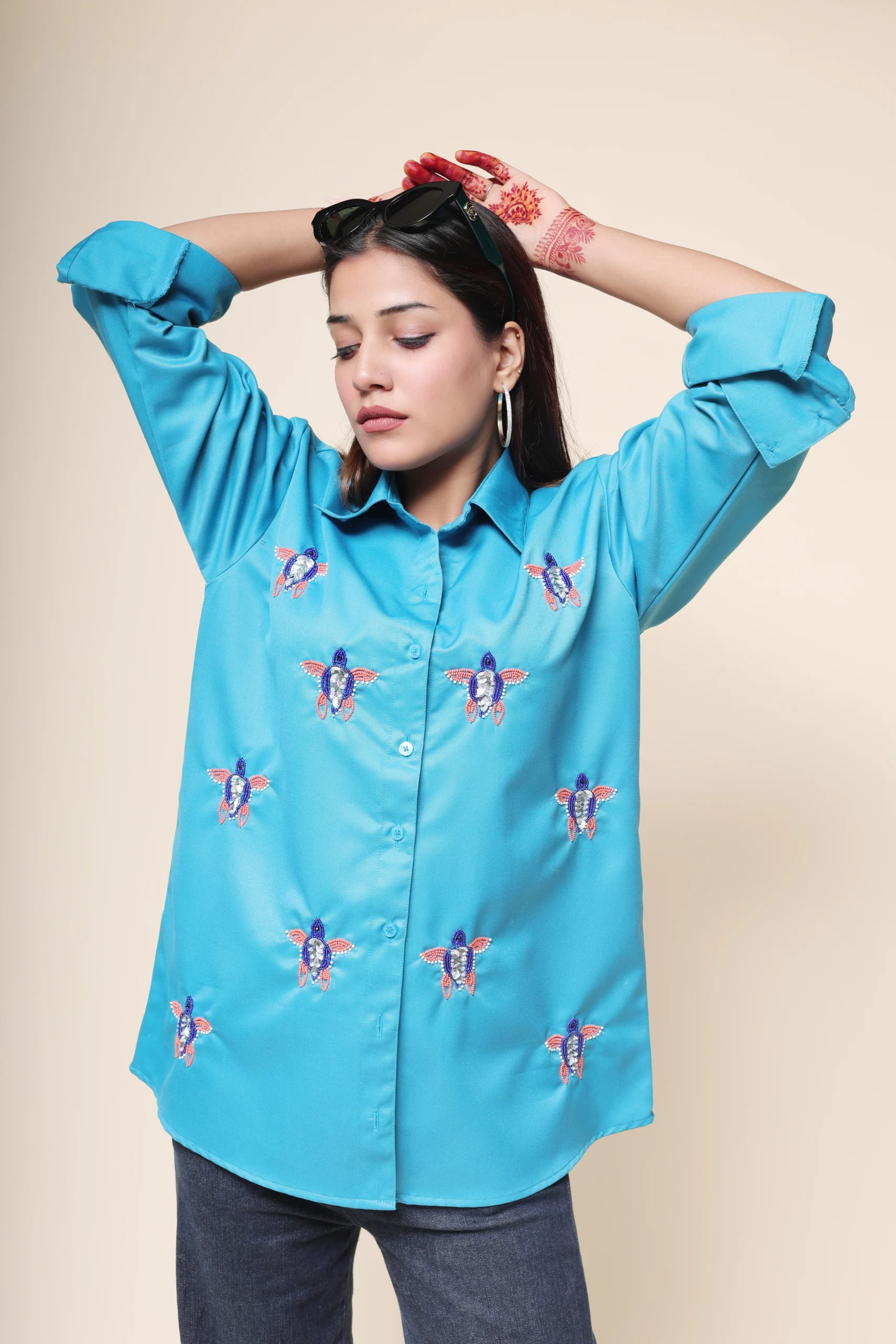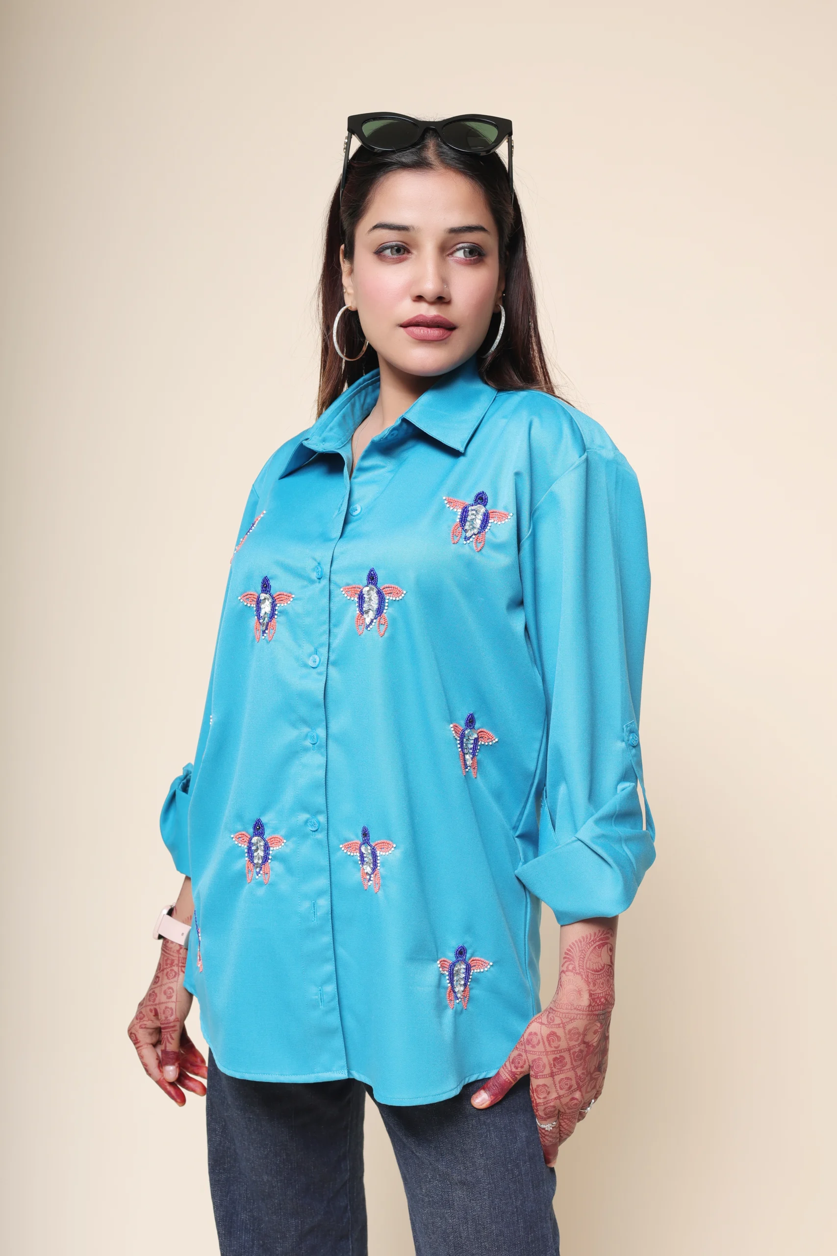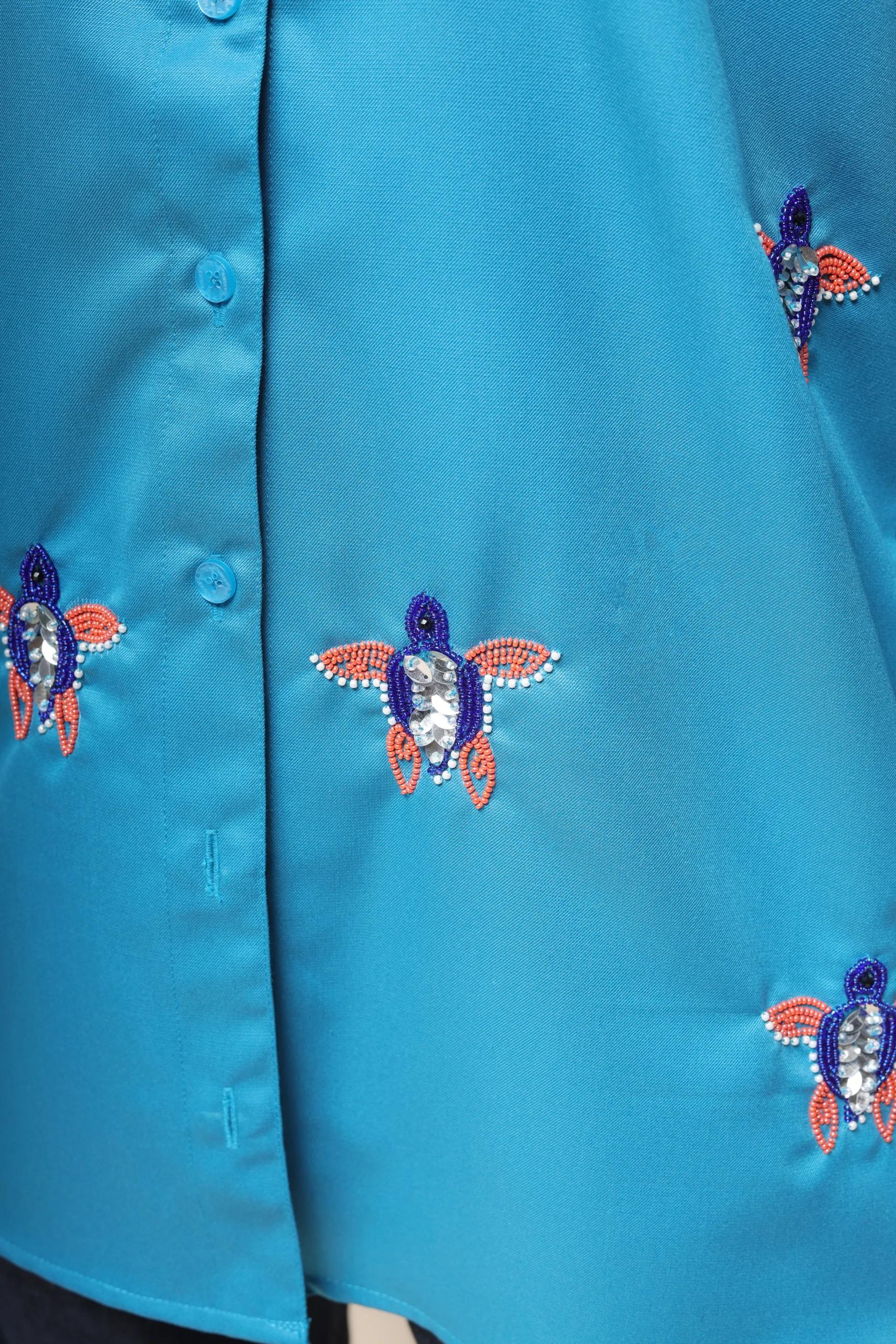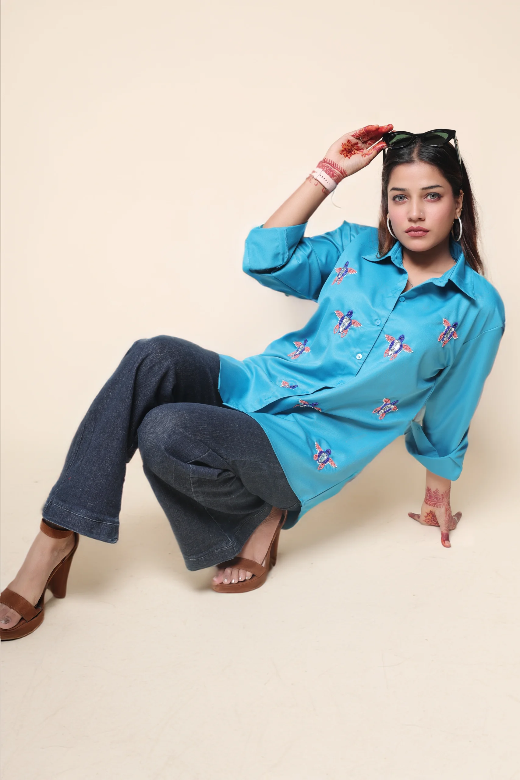 Embracing the essence of summer vibes with a touch of sky blue! There’s something magical about the way the sky and summers connect, just like this Egyptian cotton soft breezy shirt. Stay cool and stylish in this must-have piece that features scattered cute turtle motifs embroidered on the front. And let’s not forget the stunning contrast of coral and royal blue colors in these motifs!