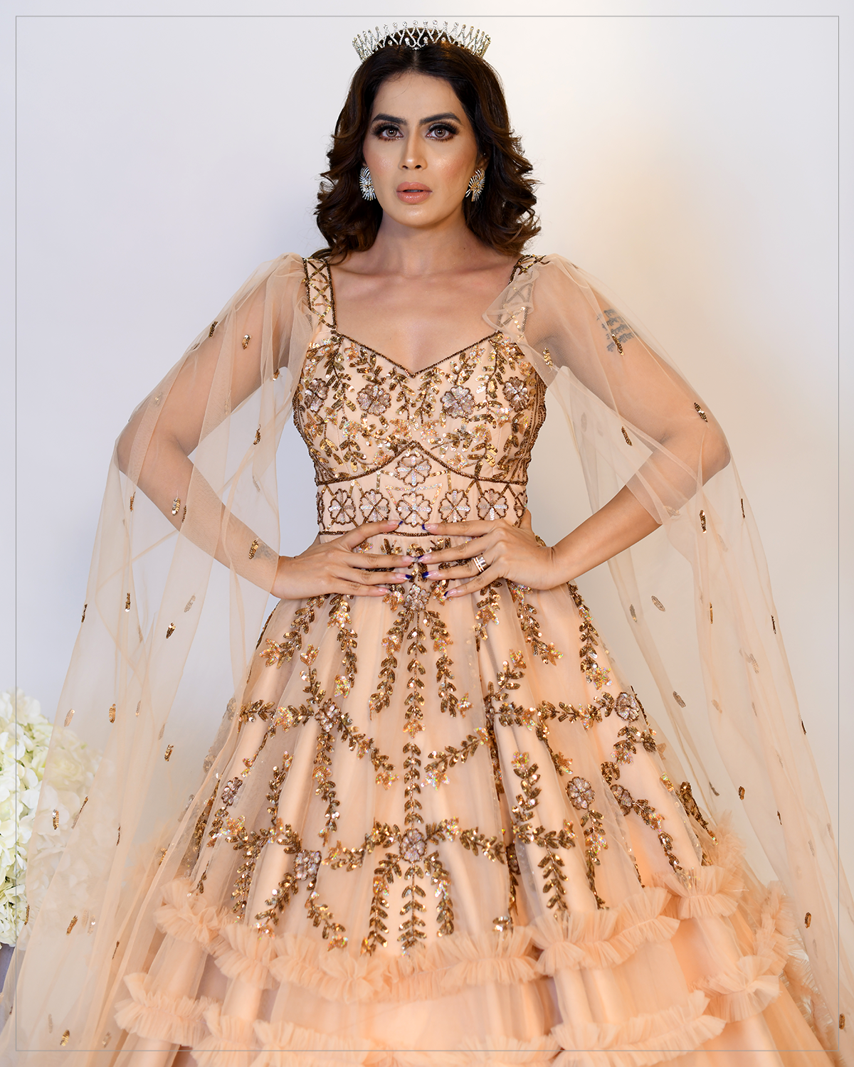 Make a statement this wedding season with this stunning peach-colored flowing gown crafted out of the finest tulle and most luscious silk with intricate floral patterned embroidery embellished with superior sequins and cutdana. With a fully composed bodice, long kimono sleeves along with ruffles on the gown complete the regal look making this grand design one of our favorites in the collection. Own this flatteringly chic silhouette on your dream occasion to make it the most memorable.